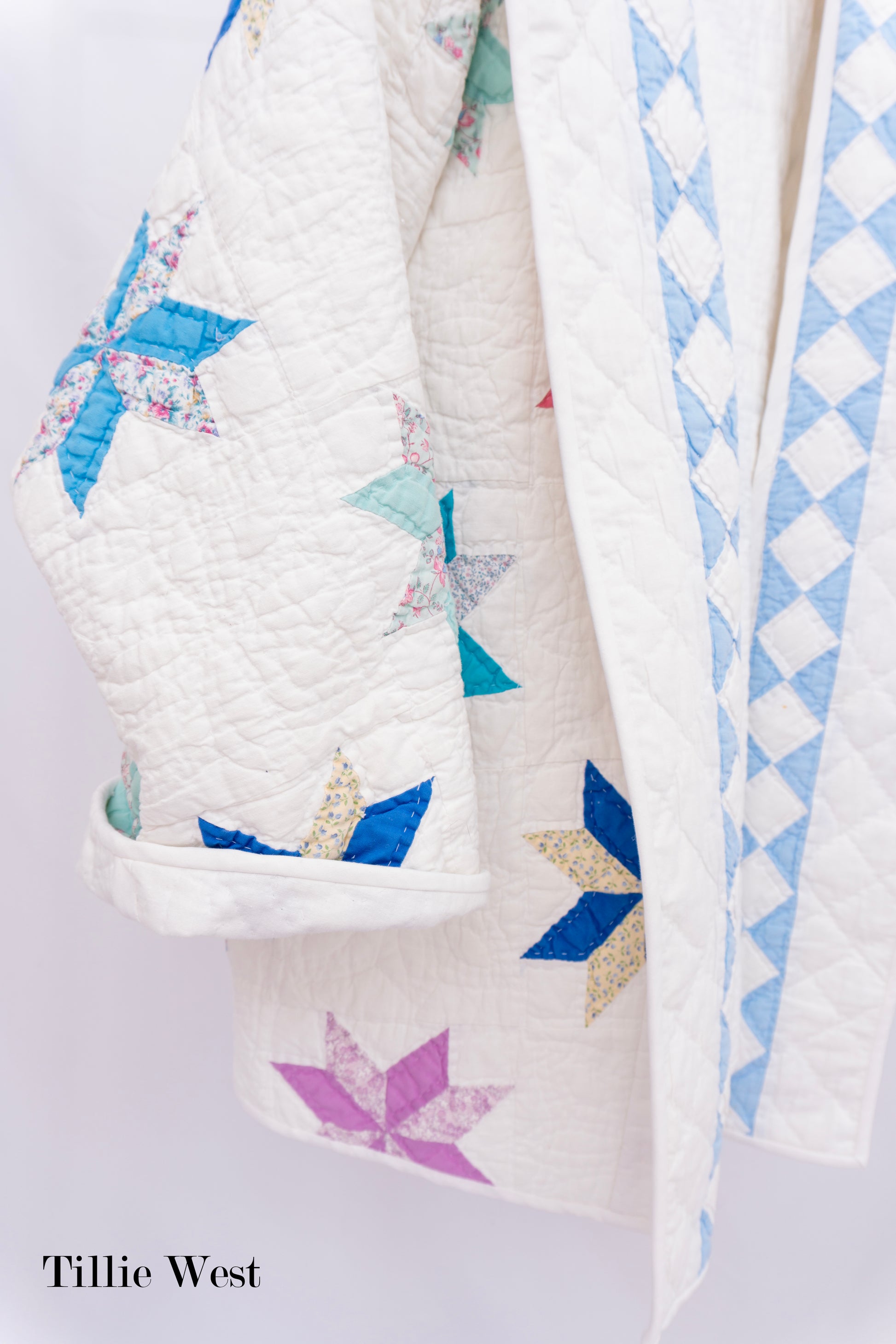 This coat was reimagined from a 1990s quilt—100% cotton and hand-quilted, originally mass-produced in China and now given a second life as a wearable heirloom. The design features classic eight-point stars scattered across a crisp white ground, with the quilt’s blue-and-white diamond border cleverly repurposed to form the long, robe-style collar. The silhouette is slouchy and comfortable with an easy, draped feel—perfect as a cozy, baggy fit for a small–medium.